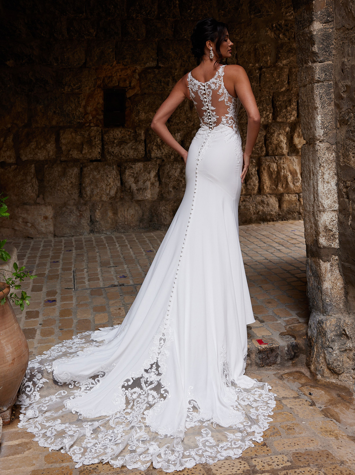 Dieser wunderschön verzierte Meerjungfrauenstil, mit einem floralen Spitzenoberteil, rundem Ausschnitt und ärmellosem Design, wird Sie sprachlos machen. Der Rücken, bedeckt mit Spitze und einer Reihe kleiner Knöpfe, geht in den Chiffonrock über und setzt sich über die atemberaubende, spitzenverzierte Schleppe fort, sodass Ihre Gäste beim Gang zum Altar vor Bewunderung staunen werden.