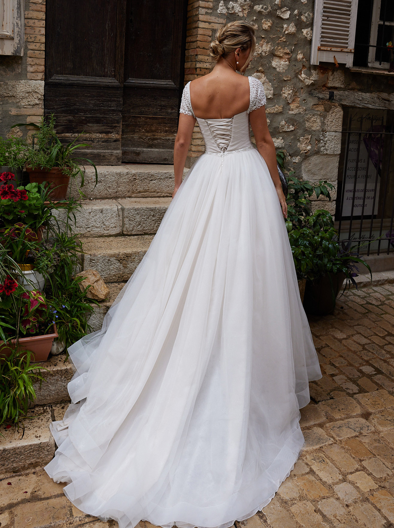 A "yes, I do" for this romantic design with a sweetheart neckline bodice, lace shoulder straps, and a flowing tulle skirt with layers that move gracefully. The corset back with lace-up detailing adds that glamorous touch you desire.